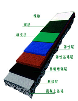 塑材软垫及丙烯酸涂面系统,其厚度约为3-4mm。内含百分百无机性纤维颜料,铺设在已冲洗干净值良好及排水斜度(1:100至1:150之内)的水泥或沥青地面基础上。